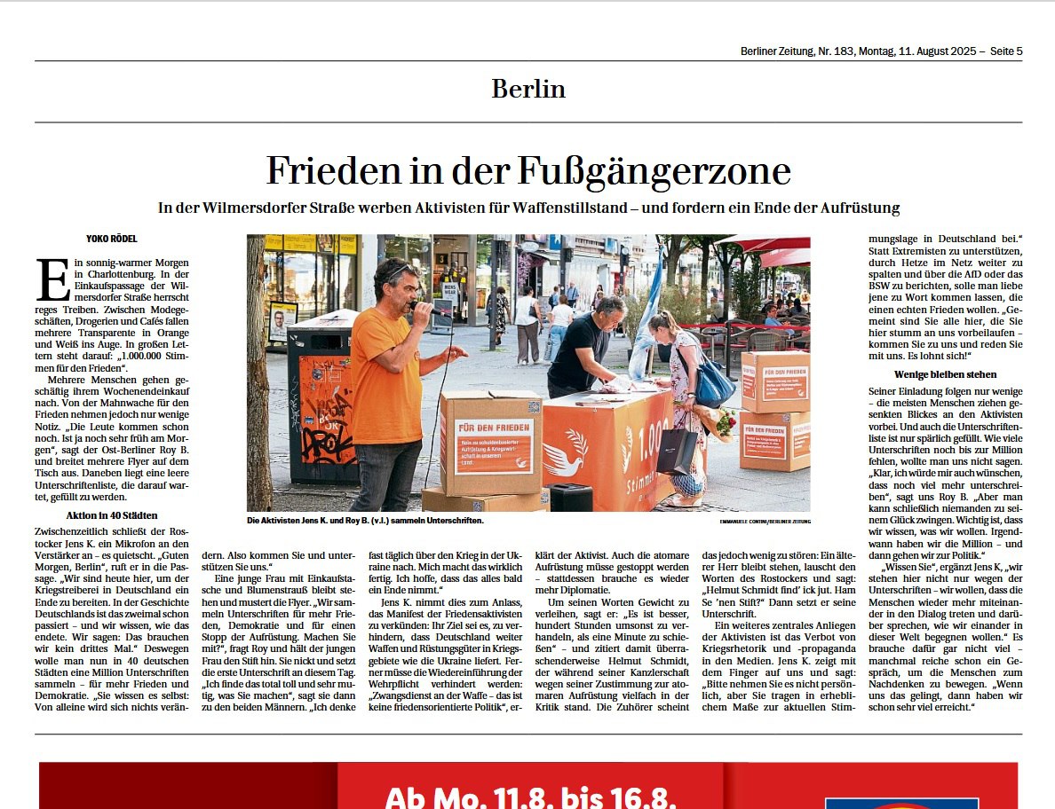 Ein sonnig-warmer Morgen in Berlin-Charlottenburg. In der Einkaufspassage der Wilmersdorfer Straße herrscht reges Treiben. Zwischen Modegeschäften, Drogerien und Cafés fallen mehrere Transparente in Orange und Weiß ins Auge. In großen Lettern steht darauf: „1.000.000 Stimmen für den Frieden“.