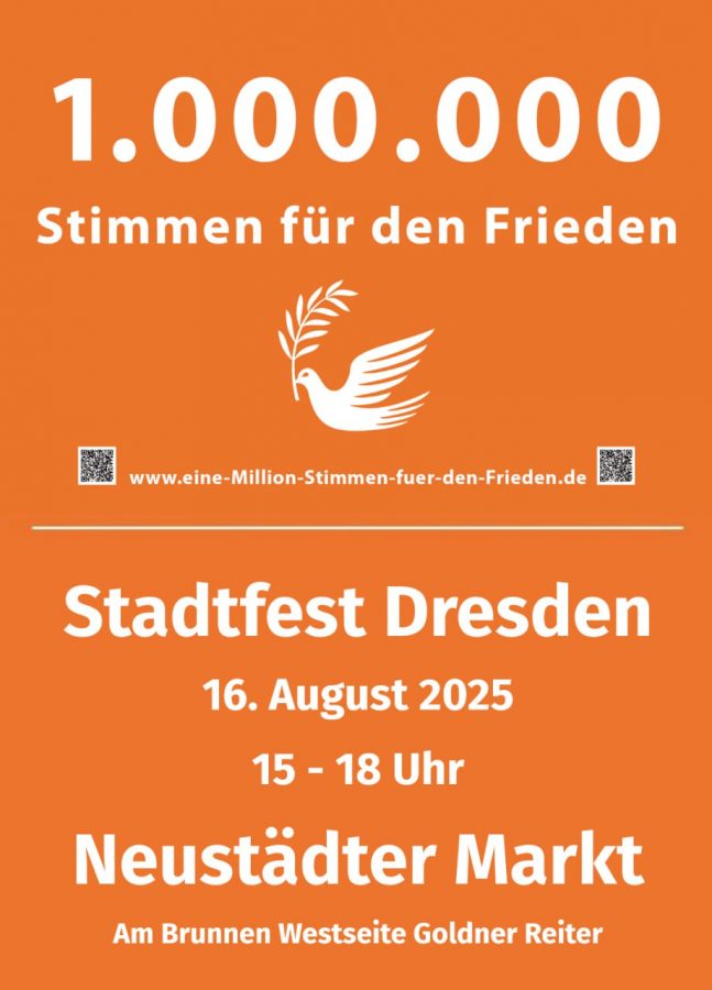 Ja, natürlich wird es in Dresden selbst nicht 1.000.000 Stimmen für den Frieden geben. Nur schauen wir, wenn in 1.000 Städten/Orten dieses orangene Banner friedlich auch in den Aufzügen und Friedensspaziergängen zu sehen ist und sich JEDER selbst, jeder Ort als ein konkretes Puzzle-Teil von 1.000 begreift, dann fühlt sich das gut an. Dann ist jeder einzelne und jeder Ort nicht mehr allein. WIR alle fühlen uns dann in einer großen Bewegung von Vätern, Müttern und Großeltern miteinander verbunden und WIR wissen dann, dass wir gemeinsam für das gesellschaftlich wichtigste zusammen agieren: für den Frieden, UNSERERN FRIEDEN.