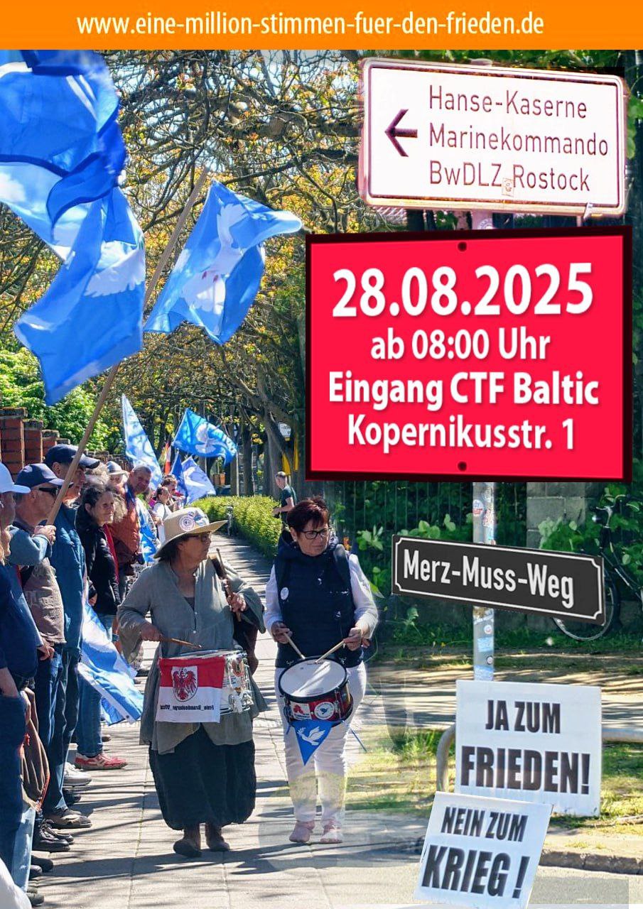 Friedrich Merz kommt nach Rostock – mit dem Kurs der Kriegspolitik – lasst uns Hunderte sein und eine lange Kette entlang der Kaserne bilden, damit er unserem Protest nirgendwo entkommt.